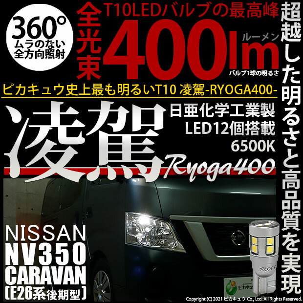 【車幅灯】ニッサン NV350キャラバン[E26系 後期モデル]ポジションランプLED 日亜化学工業製LED12個搭載T10 凌駕-RYOGA400-ウェッジシングル球 全光束:400lm LEDカラー:ホワイト6500K 1セット2個入 他を凌駕する驚異の明るさ400ルーメン(11-H-19)