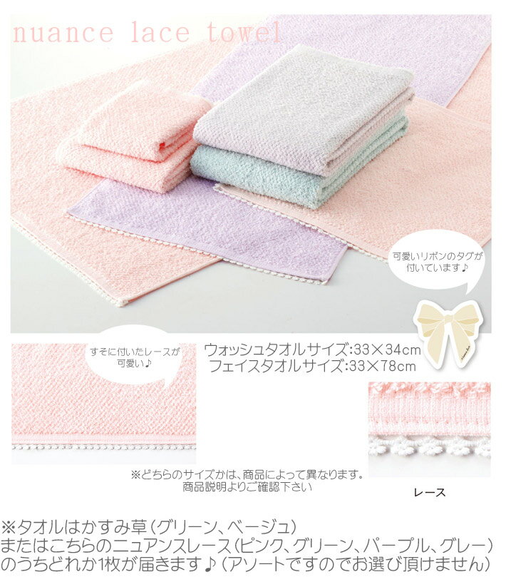 ベージュまたはグリーンのかすみ草デザイン、または裾のレースが可愛いニュアンスレース(ピンク、ブルー、グレー、パープル) から1枚、アソート発送になります。