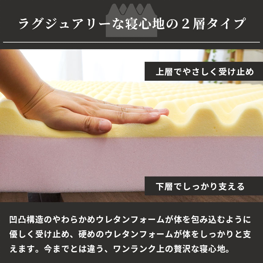 おすすめポイント ・ラグジュアリーな寝心地の2層タイプ 凹凸構造のやわらかめウレタンフォームが体を包み込むように優しく受け止め、硬めのウレタンフォームが沈み込みすぎないように体をしっかりと支え、スムーズな寝返りをサポートします。