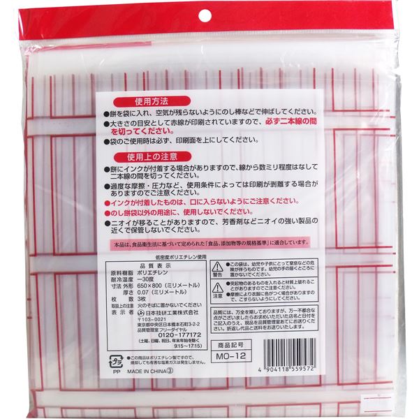 のし餅袋 3升用 3枚入のし餅作りに便利な餅のし袋!餅専用袋で使いやすい!! 【原料樹脂】ポリエチレン【耐冷温度】-30度【寸法 外形】650×800(ミリメートル)【厚さ】0.07(ミリメートル)【使用方法】・餅を袋に入れ、空気が残らないようにのし棒などで伸ばしてください。