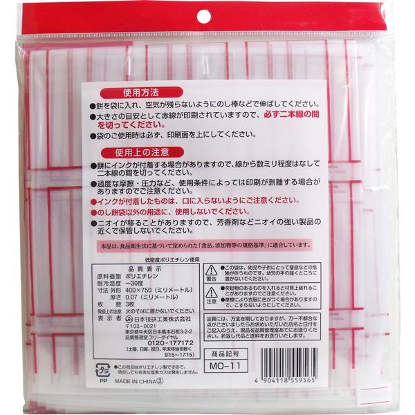 のし餅袋 2升用 3枚入のし餅作りに便利な餅のし袋!餅専用袋で使いやすい!! 【原料樹脂】ポリエチレン【耐冷温度】-30度【寸法 外形】400×750(ミリメートル)【厚さ】0.07(ミリメートル)【使用方法】・餅を袋に入れ、空気が残らないようにのし棒などで伸ばしてください。